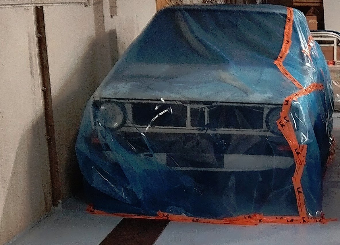 Caddy joutui olemaan muutamia kuukausia pressujen alla ulkona, kunnes se jälleen mahtui halliin. Ja voi vain arvata, että oliko pellille asti hiottu auto ruosteessa tuolloin.... No, hioin sen uudestaan ja kävin ostamassa maalit.