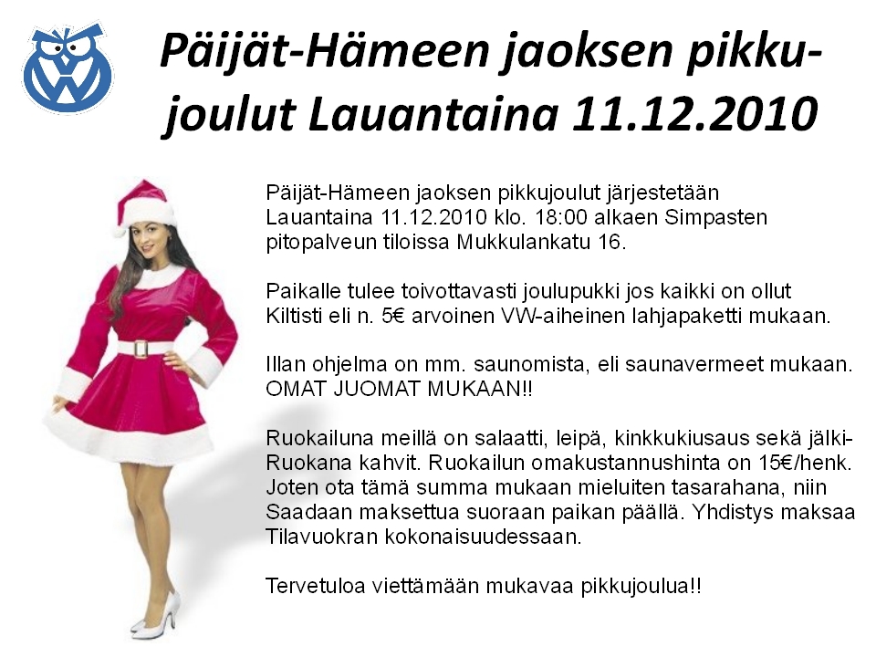 Pikkujoulut lauantaina 11.12.2010 klo. 18:00 alkaen Simpasten pitopalvelun tiloissa Mukkulankatu 16. Pikkujouluissa mahdollisuus saunoa eli saunakamat mukaan. Ota myös n. 5€ arvoinen pikkujoululahja mukaan jos sattuu pukki tulla käymään!